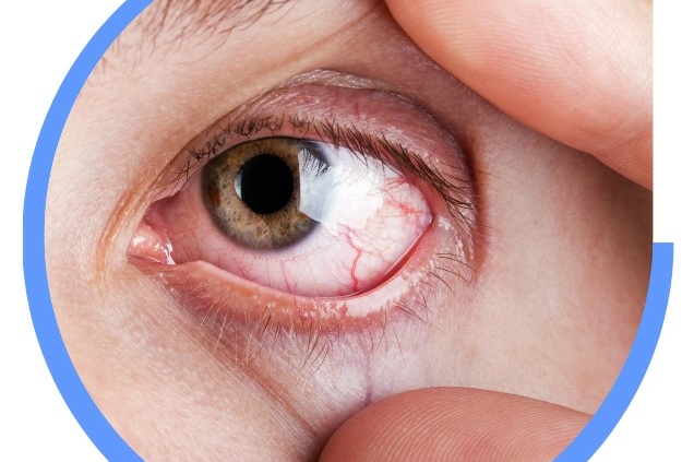 - Redness: Red eyes, caused by irritation and dilation of blood vessels in the conjunctiva due to dry eye.
